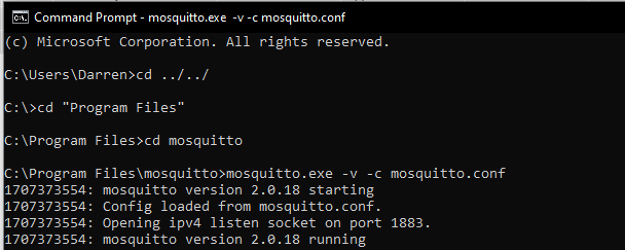 5. Type "cd mosquitto [[enter]]". To start the mosquitto MQTT broker, type "mosquitto.exe -v -c mosquitto.conf [[enter]]"